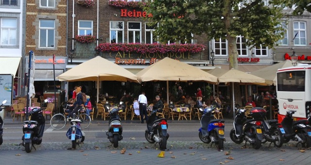Maastricht rests at the base of the Netherlands, nestled between Belgium to the West, and Germany to the East. Soon after our arrival Francoise and I are led to the city centre by her friends (and our enthusiastic and engaging hosts), Ilja and Ivo. As we walk towards the spires that lance the skies above the city centre, the streets shrink and the buildings grow. While strolling we’re constantly passed by cyclists on gearless grandma bikes. The age of the bikes and their poorly mounted bells ensure they never approach silently as they judder and clatter down the bricked lanes. My mood shifts between delighted and charmed as I hear and smell the cafes and bars, and glance down the narrow alleys that run between the aged building frontages.